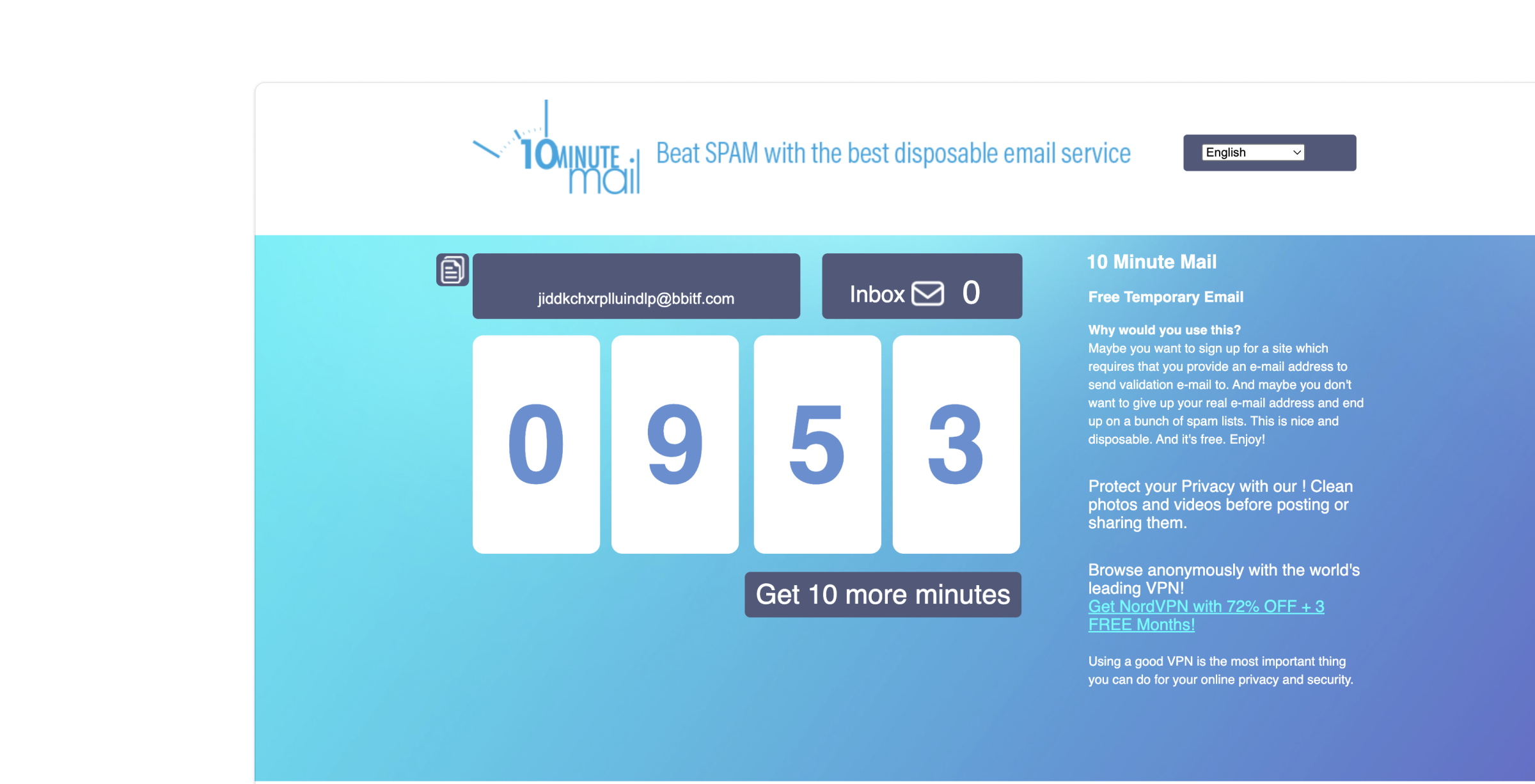 Source: 10 Minute Mail10 Minute Mail generates an automated email ID with a 10-minute timer. You must complete the activity within the time window, and the address will self-destruct on expiry or when you close the tab or window—whatever happens first. There is no way to recover or revisit the inbox.10 Minute Mail is designed for verifications only, so you cannot use it to send emails. You can extend the one-way service by clicking Get 10 more minutes within 60 seconds of the email expiry.