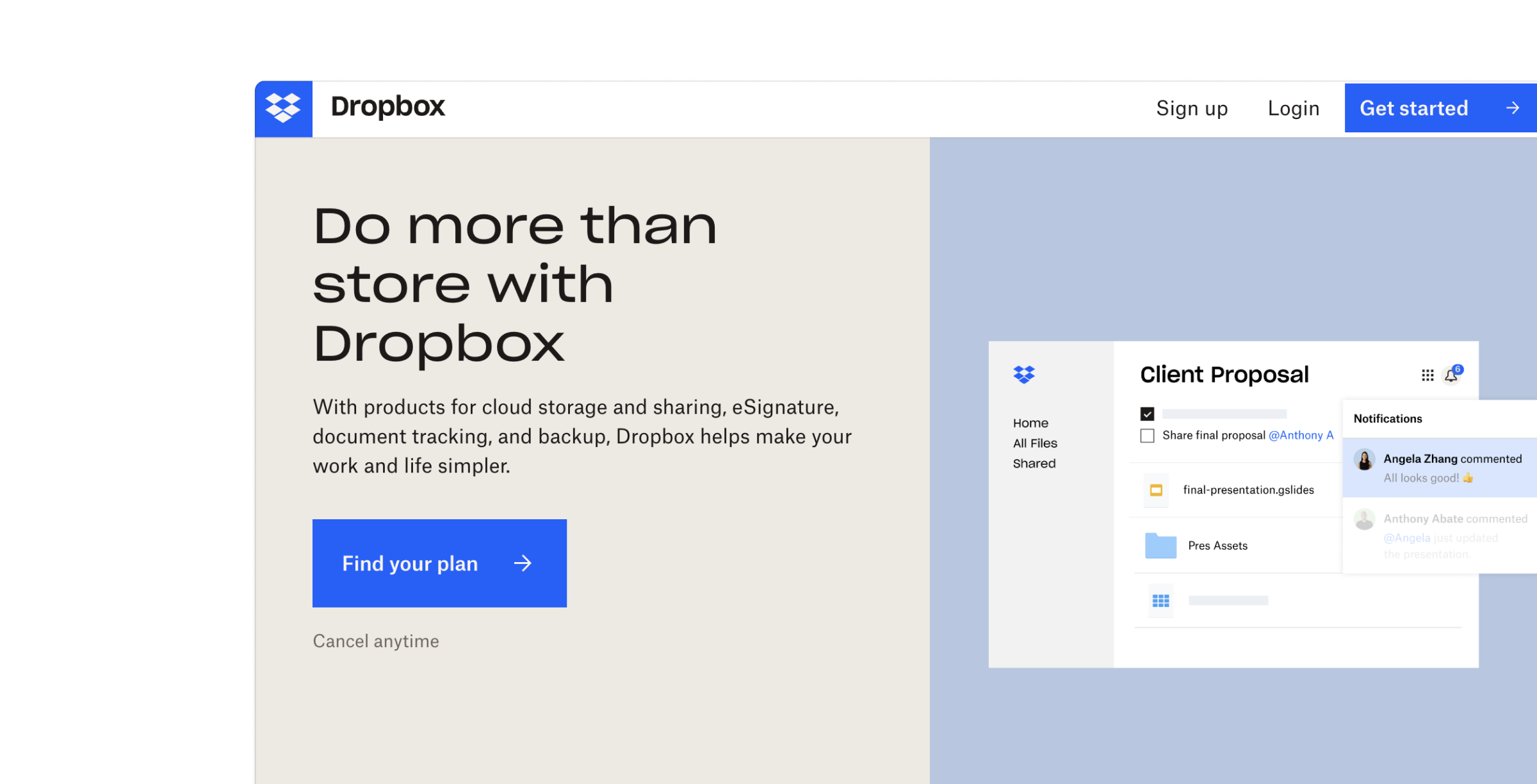 Source: DropboxDropbox is an integral part of many remote teams, as it’s packed with organization and collaboration features. It’s on the expensive side, though, which might be problematic for users on a budget.