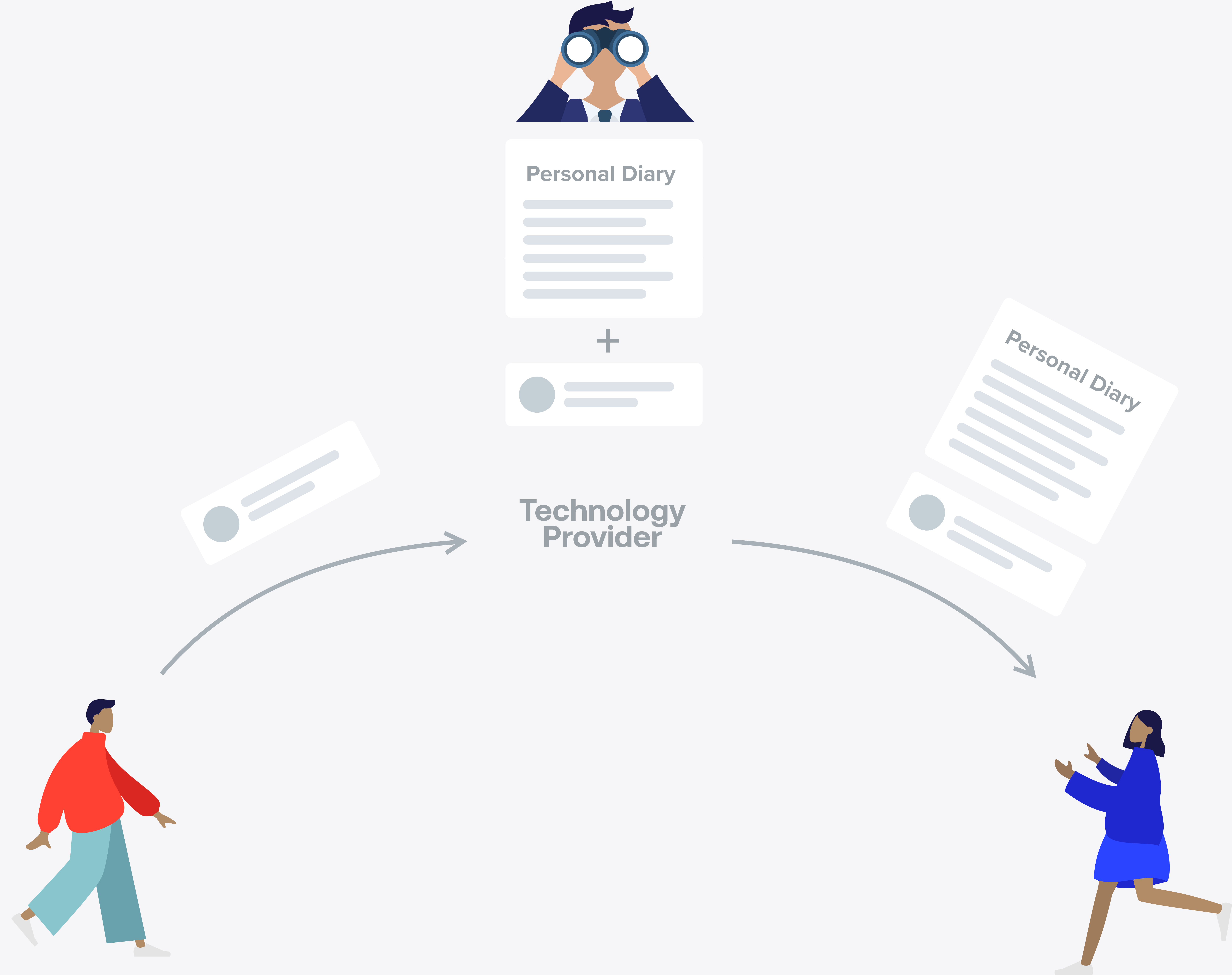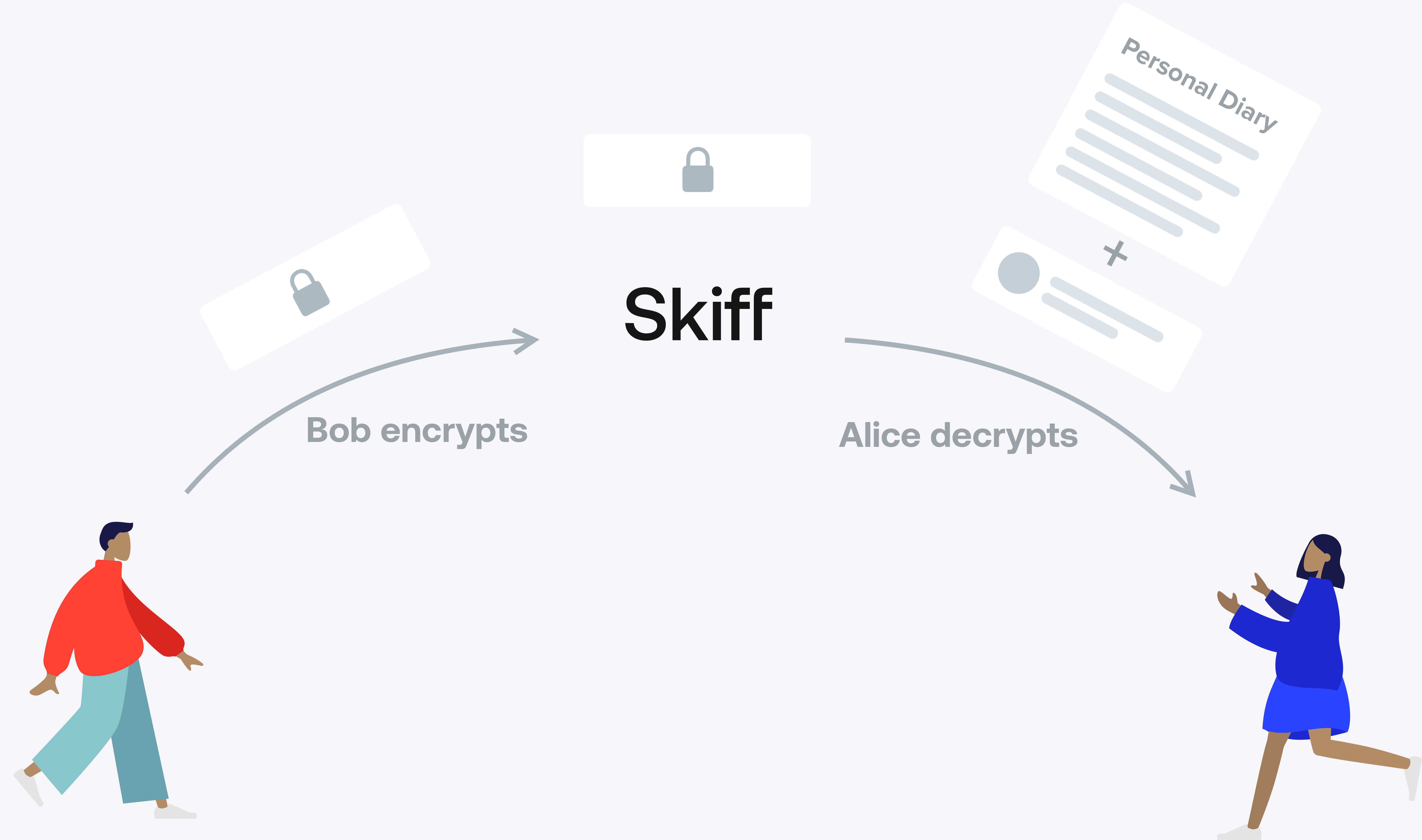 In this second diagram, we share Skiff's version. Bob makes an edit, and - before sending it to the provider - encrypts it with a symmetric encryption key shared only between him and Alice (and never shared with Skiff). Alice then receives Bob's encrypted edit, performs validation and decryption, and subsequently merges it into the document.In the Skiff E2EE case, however, Alice and Bob's document is kept private to the intended recipients and never exposed to any central technology provider. In this way, data ownership is decentralized and private to the two editors Alice and Bob, as it should be. The first case requires that Alice and Bob trust that service provider's databases, endpoints, and servers are protected from data breaches, misuse, and cyberattacks. In the second (E2EE) case, Skiff case adds a layer of encryption to their private information that is unbreakable by the technology provider. The Skiff model is how all consumer technology should be built - even if you're not protecting sensitive healthcare or financial data (and you just prefer privacy).The Skiff model doesn't just keep Alice and Bob's diary for their eyes only. It is fundamentally designed, from the ground up, to authenticate and protect personal and sensitive information. Once systems are designed, built, and scaled, it is difficult to increase privacy and extremely challenging to simply add end-to-end encryption. At Skiff, we've spent years building modern privacy and cybersecurity as the cornerstone of products that look and feel like those we love to use today. For more details, check out our white paper here.