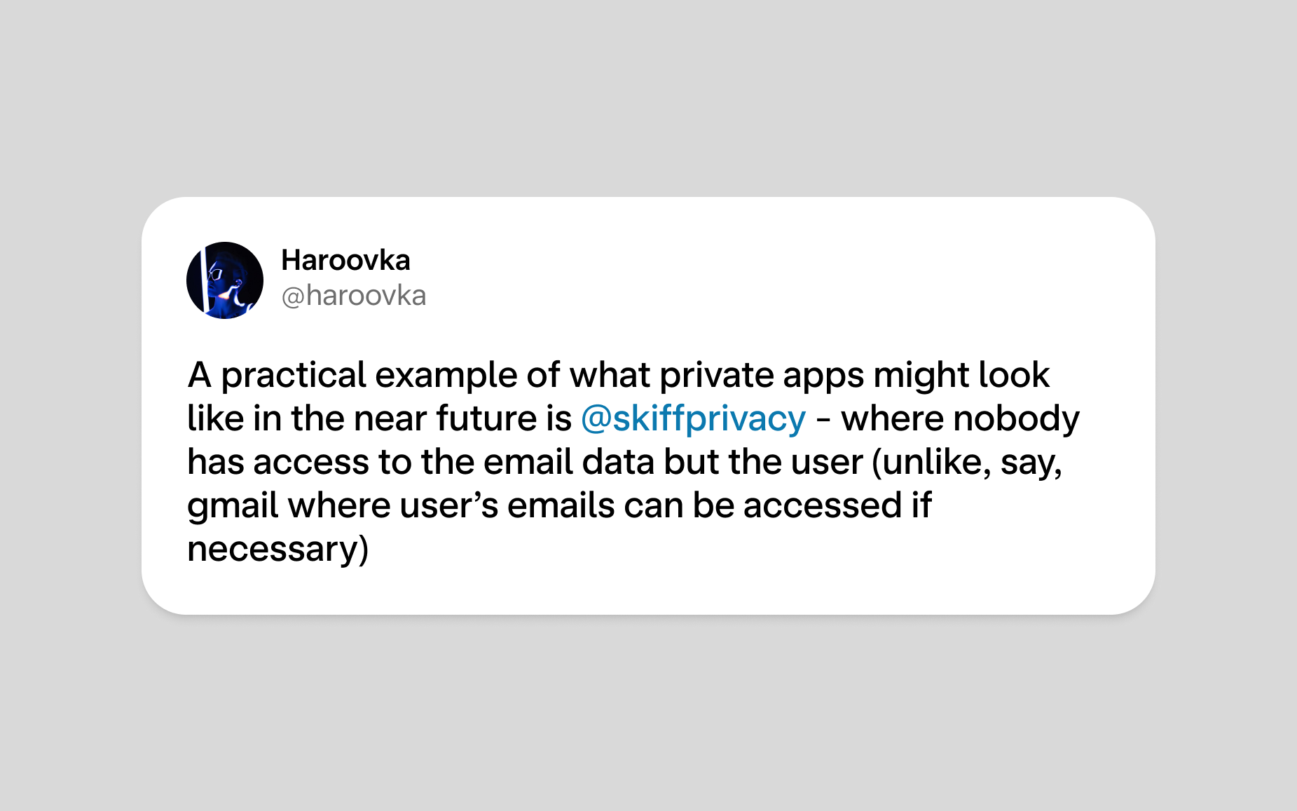 Skiff's end-to-end encrypted product suite offers privacy-first file storage, real-time collaboration, documents, notes, calendar, and email.Every Skiff user has access to the following products:- Skiff Mail (end-to-end encrypted, private email)