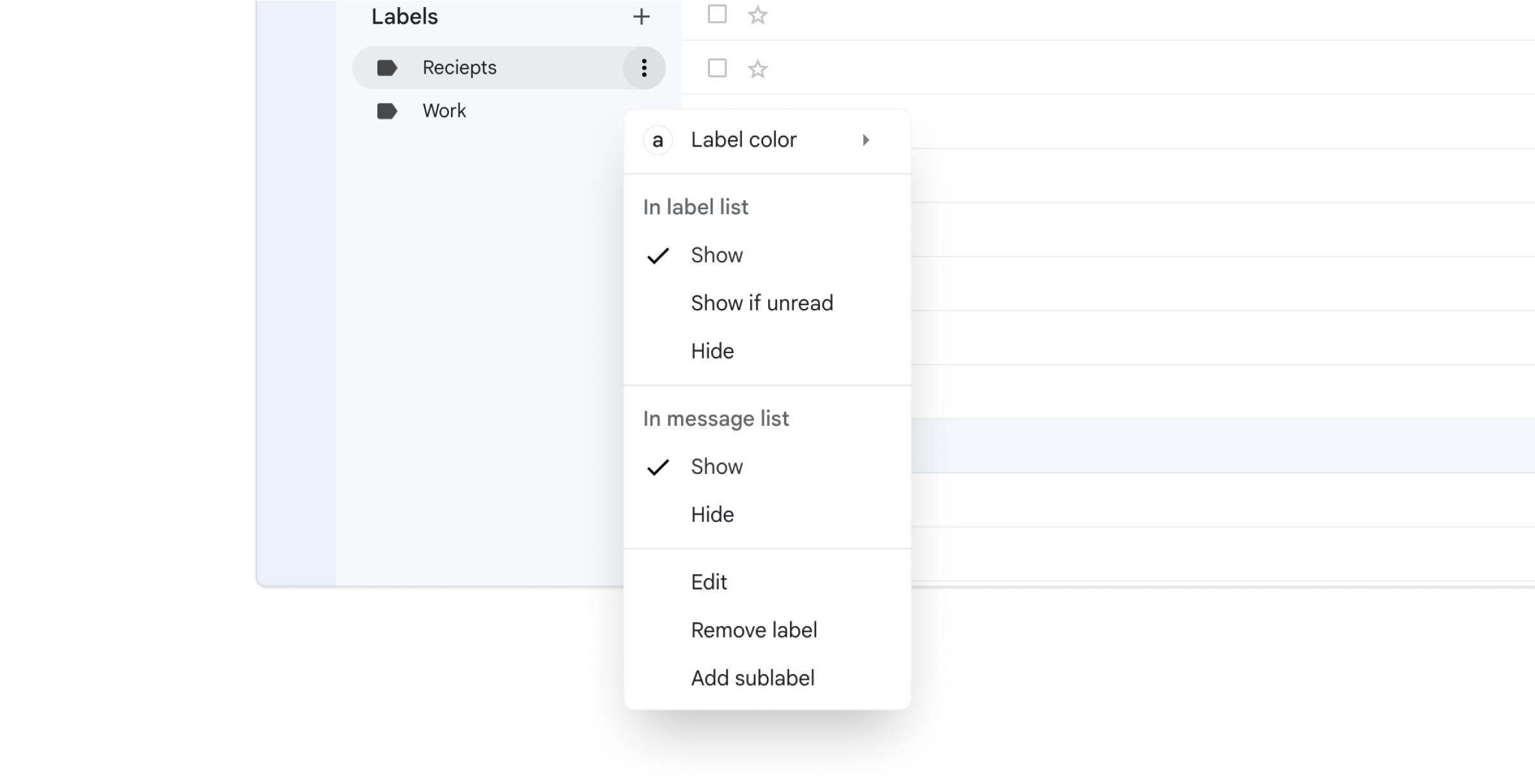 If you need to further categorize your mail within specific labels, you can add a sublabel for additional clarity. Follow these steps to create one:- Hover the mouse over your label and click the three-dot icon