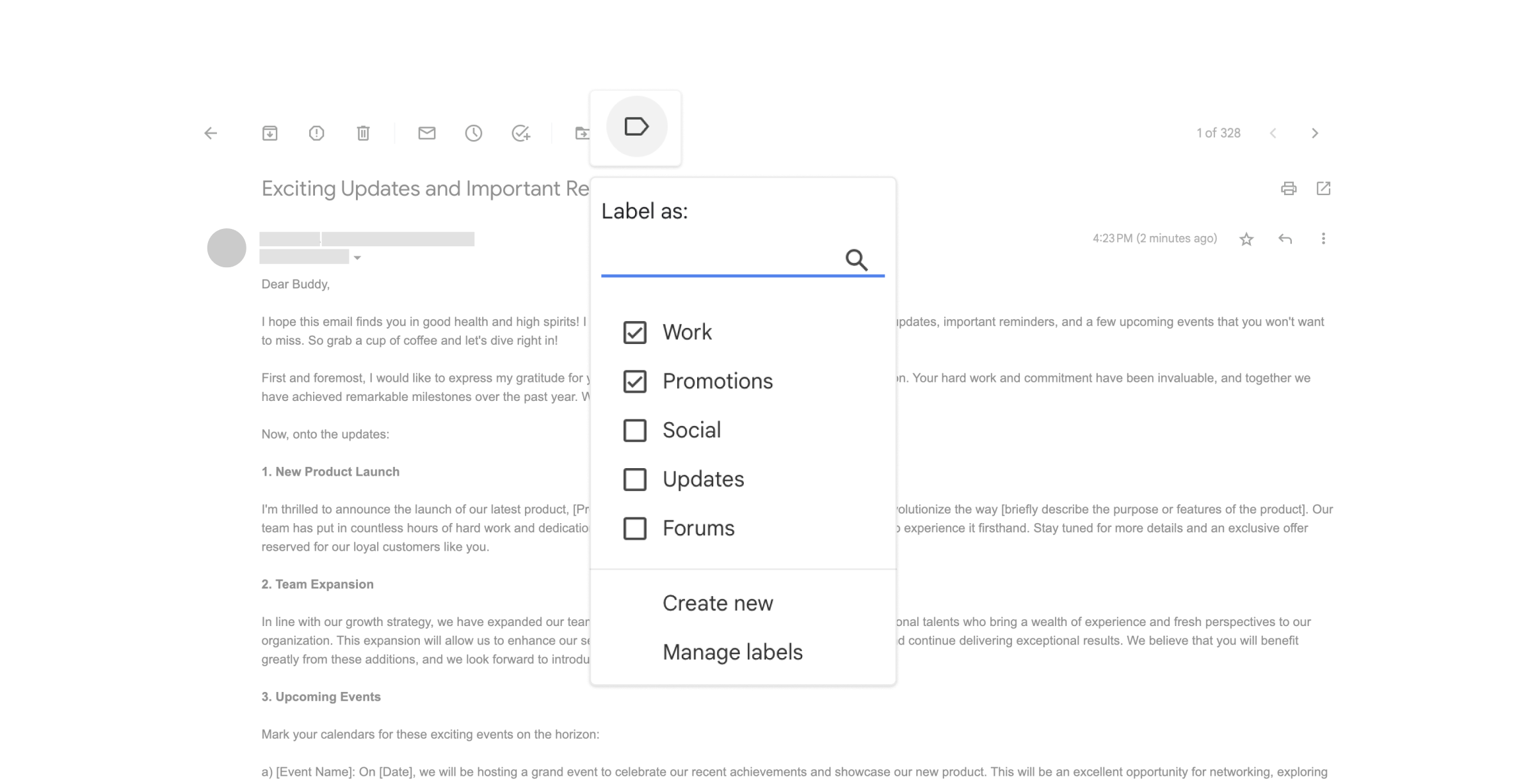 Source: Gmail screenshotThe new label will appear under the Labels section, so you can click on it to see all the emails classified under it. To label an email, open it and click the tag icon in the upper menu, as shown below.