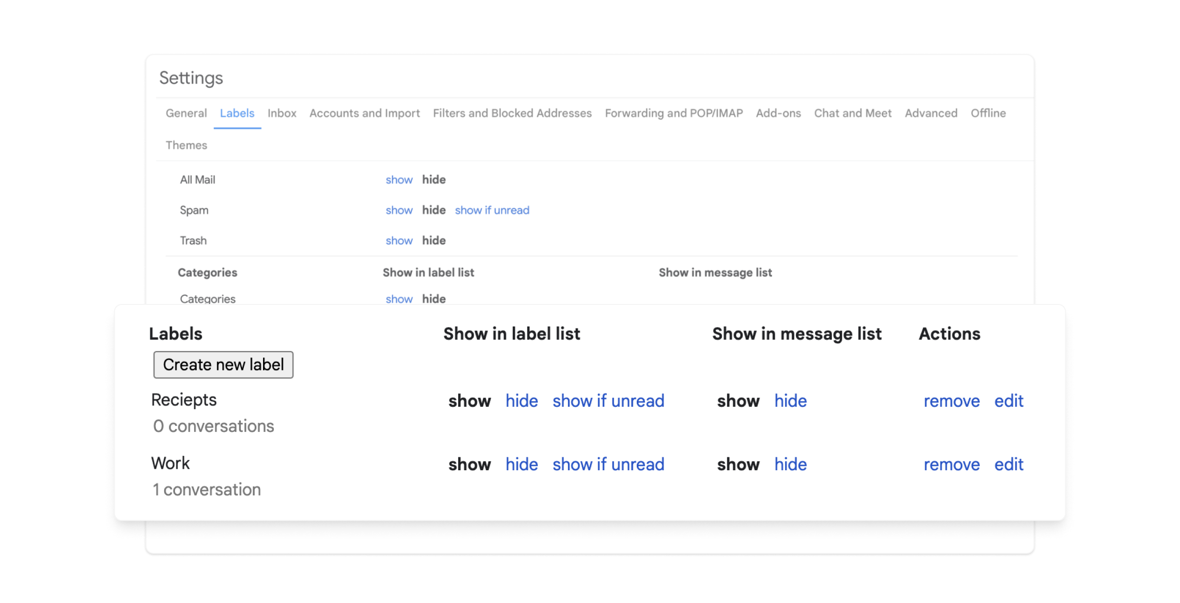 Gmail makes it easy to modify or delete labels. You can find both options by clicking the three-dot icon next to the label you want to edit/remove.Source: Gmail screenshotThe Edit option lets you rename the label or nest it under another one, while Remove deletes it. You can also choose to hide the label if you don’t want to see it but still wish to keep it.There aren’t many label editing options besides the above-mentioned. You can use the Label color option to color-code your folders, and that’s about it. Still, this should be enough to let you keep all your mail sorted.