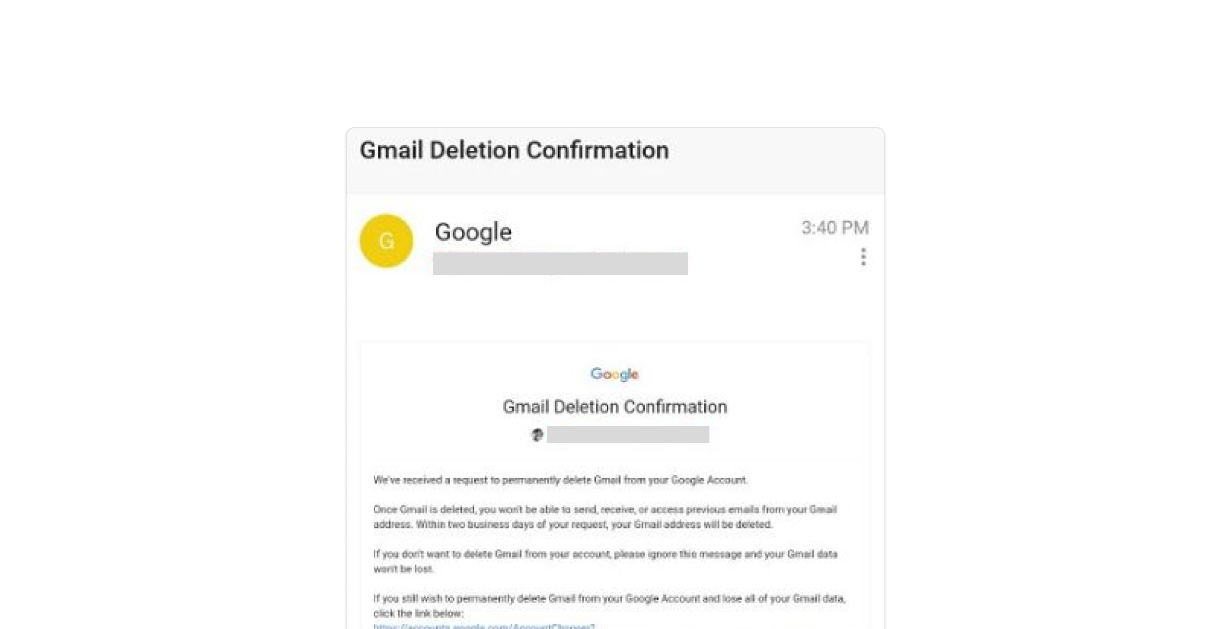 - Follow the instructions to remove your Gmail account. After choosing the Gmail option, Google will present a confirmation message explaining the impacts of eliminating your Gmail account. Comply with the instructions to continue