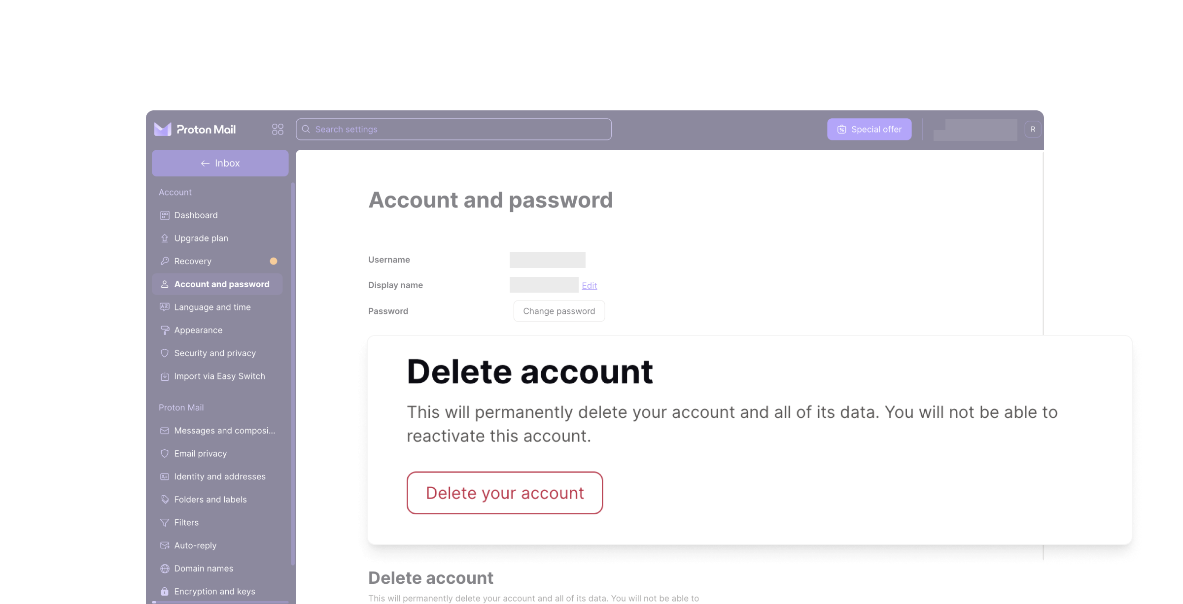 | Deleting the account permanently | If you choose to delete your ProtonMail account, it will be permanently closed. Your existing username will be blacklisted by the service provider, ensuring nobody—be it you or another person—can use the address again |