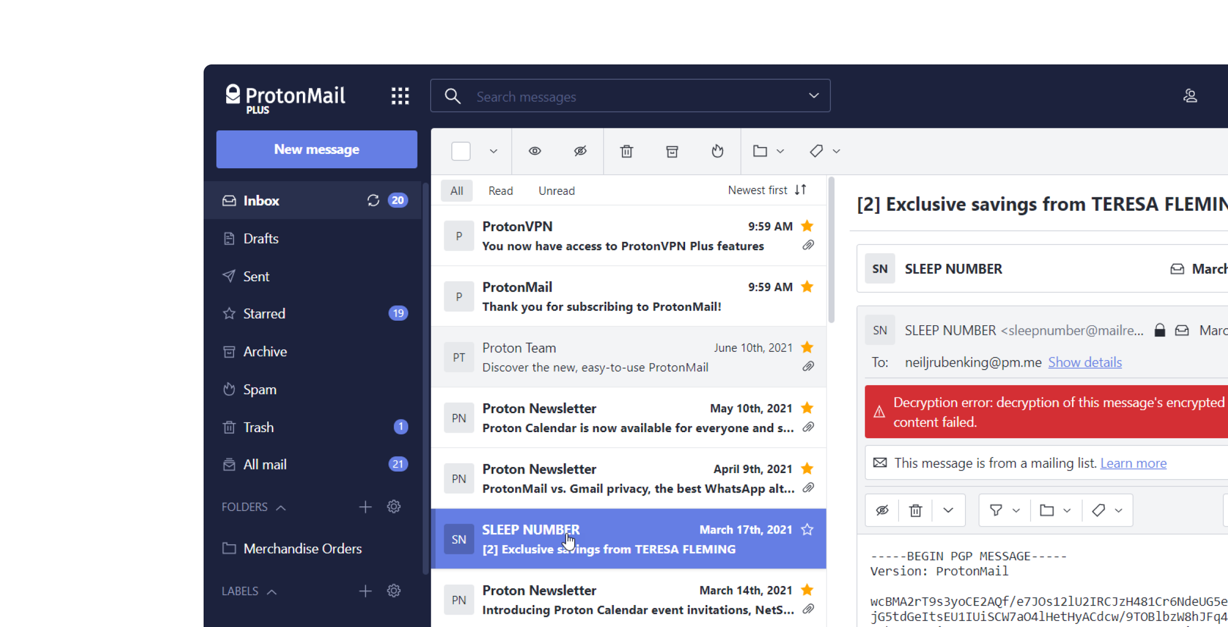 Source: Proton MailProton Mail uses strong end-to-end encryption, safeguarding all correspondence among Proton users. If the recipient uses another provider, you can use the Password-Protected Email feature instead. It lets you send a protected link that loads the encrypted message, which the recipient can open with a passphrase you set.Signing up for the platform doesn’t require any personal information, and IP addresses aren’t tracked by default, so there’s no information that a third party could tie to your account—at least in theory. Proton’s IP tracking policies are somewhat of a gray area, as you’ll see a bit later in this guide.For more security, Proton Mail offers two-factor authentication (2FA). To enable it, you'll have to install an authenticator app on your phone. Once you set it up, a unique six-digit code from the authenticator app will be required to log into your account. Even if someone guessed your password, they wouldn’t be able to access your email without the code.Proton Mail also allows users to send self-destructing messages by putting an optional expiration time on them. Upon expiry, the message will automatically be deleted from the recipient’s inbox.Overall, Proton Mail is far more secure than a typical Big Tech platform like Gmail or even native providers touted for privacy features like Apple Mail. This still doesn’t make it a universally-accepted choice among users who prioritize security.