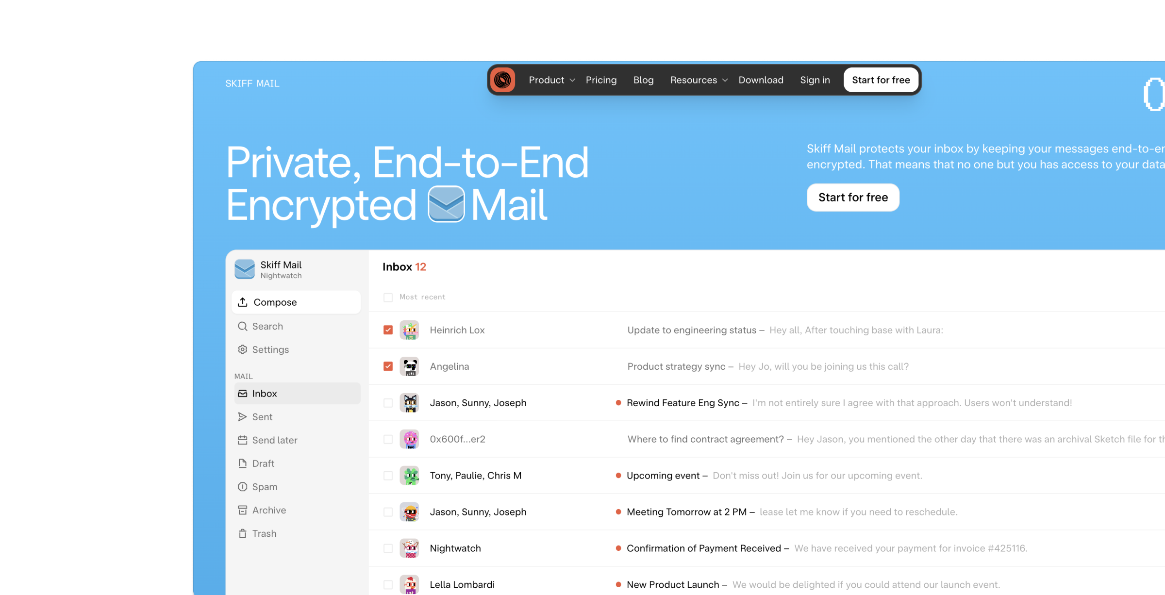 Source: Skiff MailSkiff Mail is a privacy-first email service using advanced end-to-end encryption to ensure complete security and give users full ownership of their data. It pairs strong security measures with a user-friendly interface to make privacy available to every user regardless of their tech skills.