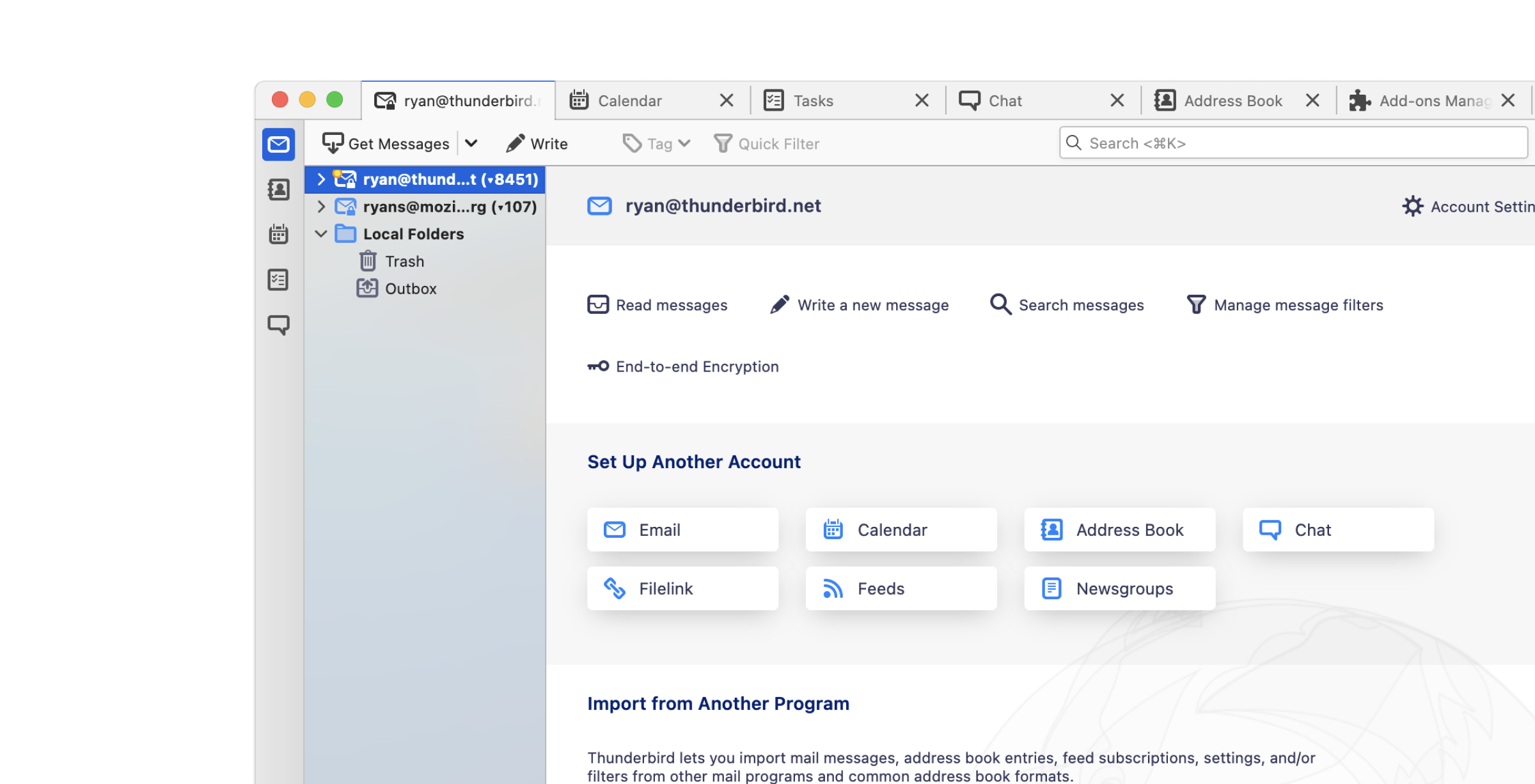 Thunderbird is free to use, which is among the main reasons for its massive adoption. No features are hidden behind a paywall, so you can explore its full potential at no cost. If you end up enjoying it enough to contribute, you can make an optional donation.The client supports three email service providers (ESPs):While the combined user base of these ESPs is large enough to give Thunderbird a wide audience, the client is still a bit exclusive. Unless you use any of the above providers, you’ll either have to migrate to one or start from scratch with a new account.On the bright side, you can add unlimited email addresses to Thunderbird, so managing multiple accounts should be straightforward.The platform’s standout feature—tabbed email—was inspired by Firefox, Mozilla’s famous browser. It lets you open emails in new tabs to manage them more easily, which is a handy option you can’t find in most clients.If you’re a privacy-conscious user, Thunderbird might not be your best choice. By default, it doesn’t support end-to-end encryption (E2EE)—the gold standard of email security, ensuring nobody but the recipient can access your emails. Thunderbird requires users to manually configure the private encryption key and enable E2EE, which can be complex and time-consuming.| Pros | Cons |