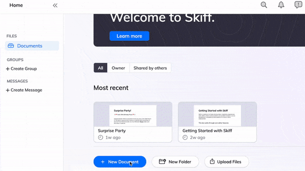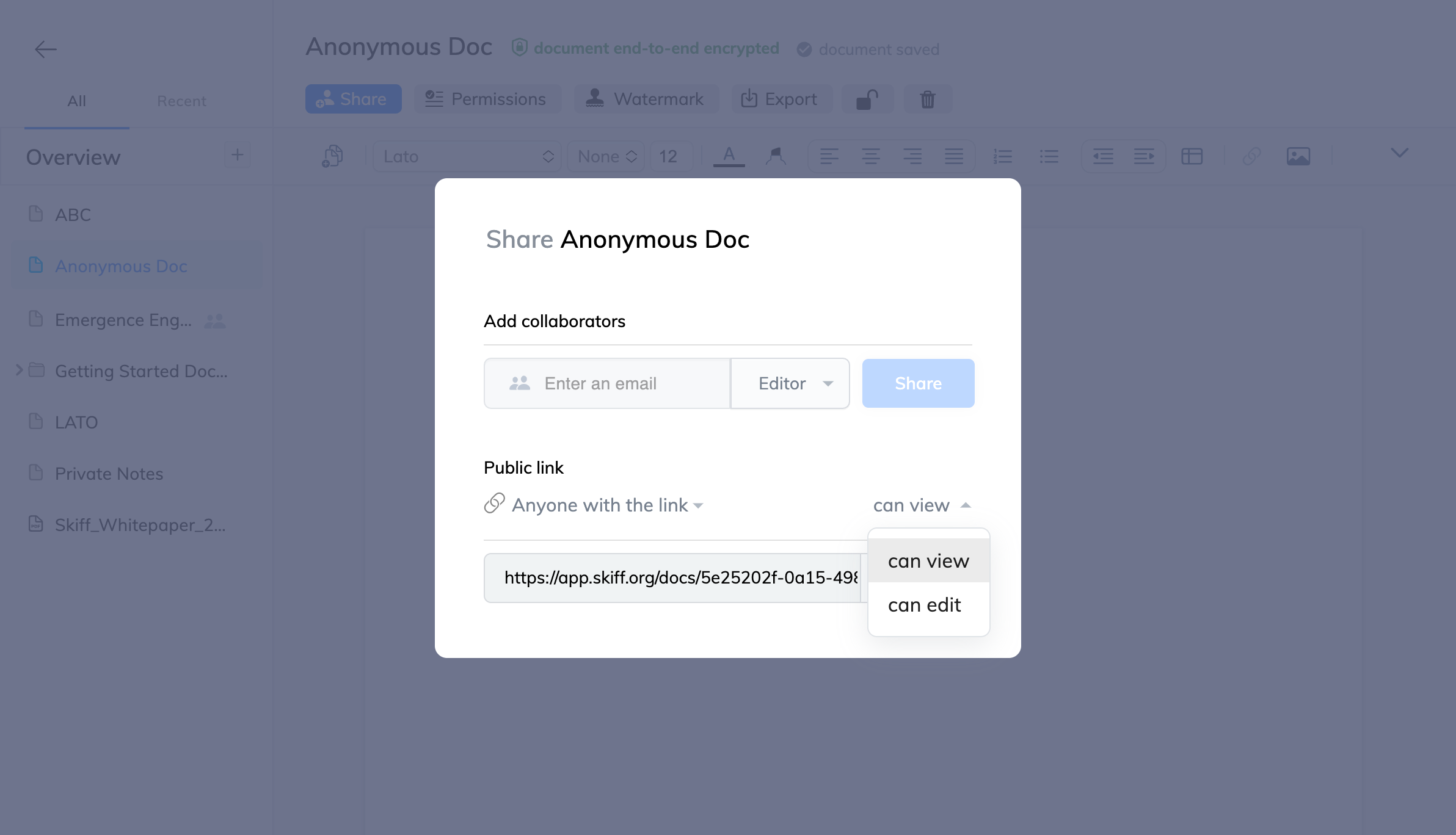 Editing via public links allows Skiff users to effortlessly collaborate on documents by sharing end-to-end encrypted links. This enables their shared collaborators - including those without Skiff accounts - to work together, view, and edit files with end-to-end encryption.Public, end-to-end encrypted link sharing allows users to collaborate on a document while maintaining complete privacy: Even users without Skiff accounts can save and edit the file. At all times, the link and file remain end-to-end encrypted, and Skiff never has access to the document or even the link itself. Furthermore, editing or viewing permissions can be revoked from the link at any time, to further protect control and the shared document.How To