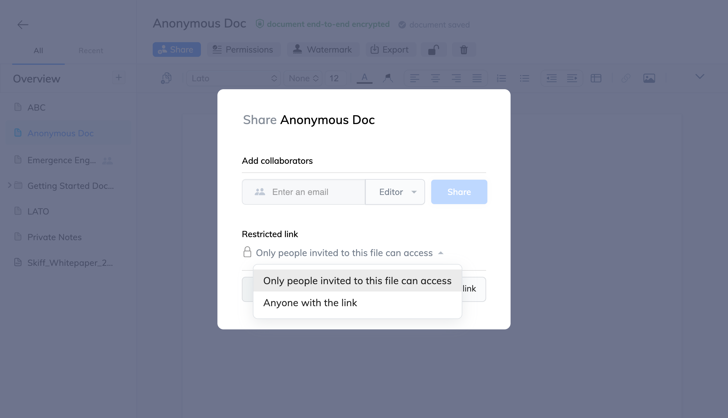 • This allows all users with the link— including those without Skiff accounts— to access the document